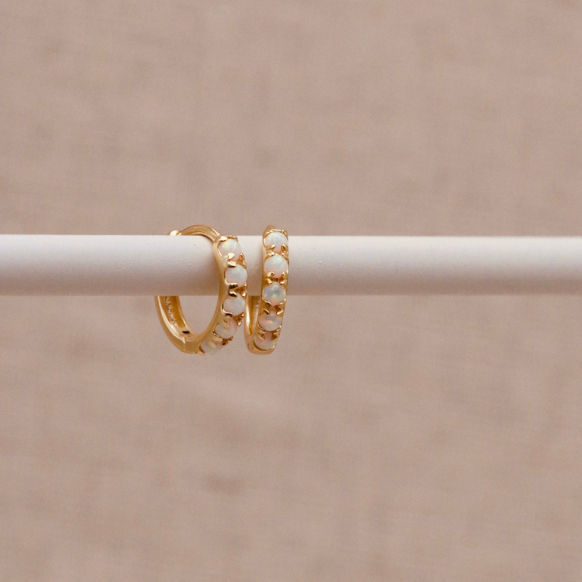 A pair of gold huggie hoops featuring 5 opal stones. The perfect minimal hoop with a twist.